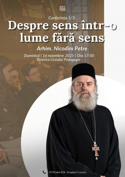 Asociația „Prietenii Sfinților Trei Ierarhi” Iași organizează în această zi, începând cu ora 17.00, conferința „Despre sens într-o lume fără sens”. Întâlnirea se va desfășura la Biserica „Sfinții Trei Ierarhi” de la Colegiul Pedagogic Iași și îl va avea ca invitat pe părintele arhimandrit Nicodim Petre, Consilierul Sectorului de Misiune, Statistică și Prognoză Pastorală al Arhiepiscopiei Iașilor și starețul Mănăstirii Bucium din Iași. Evenimentul se adresează în special elevilor, studenților și membrilor asociației. Conferința va fi precedată de Paraclisul Maicii Domnului, care va începe la ora 16.00.